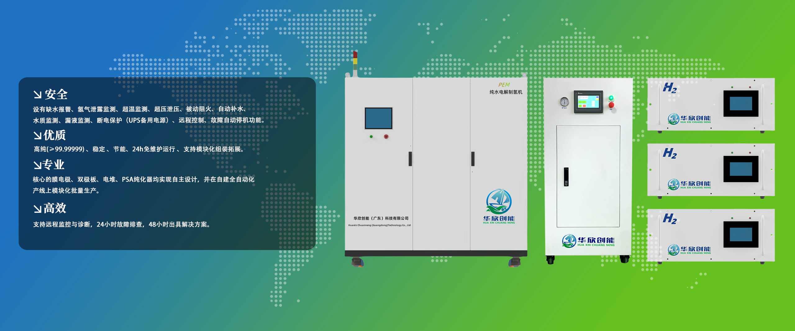华欣创能(广东)科技有限公司是中科产业技术研究院重点引进的制氢项目,是一家专注于电解制氢装备及技术服务的企业。公司集研发、设计、制造、销售、服务于一体。公司坐落于佛山市南海区桂城街道盛世腾飞智造园,已建成产线(首期)占地面积 2150 ㎡,PEM 膜电极产能 1 万㎡/年,双极板产能 2 万㎡/年,依托政府和中科院大力支持有能力、有信心为客户提供专业高效、持续稳定的产品及售后维保服务。